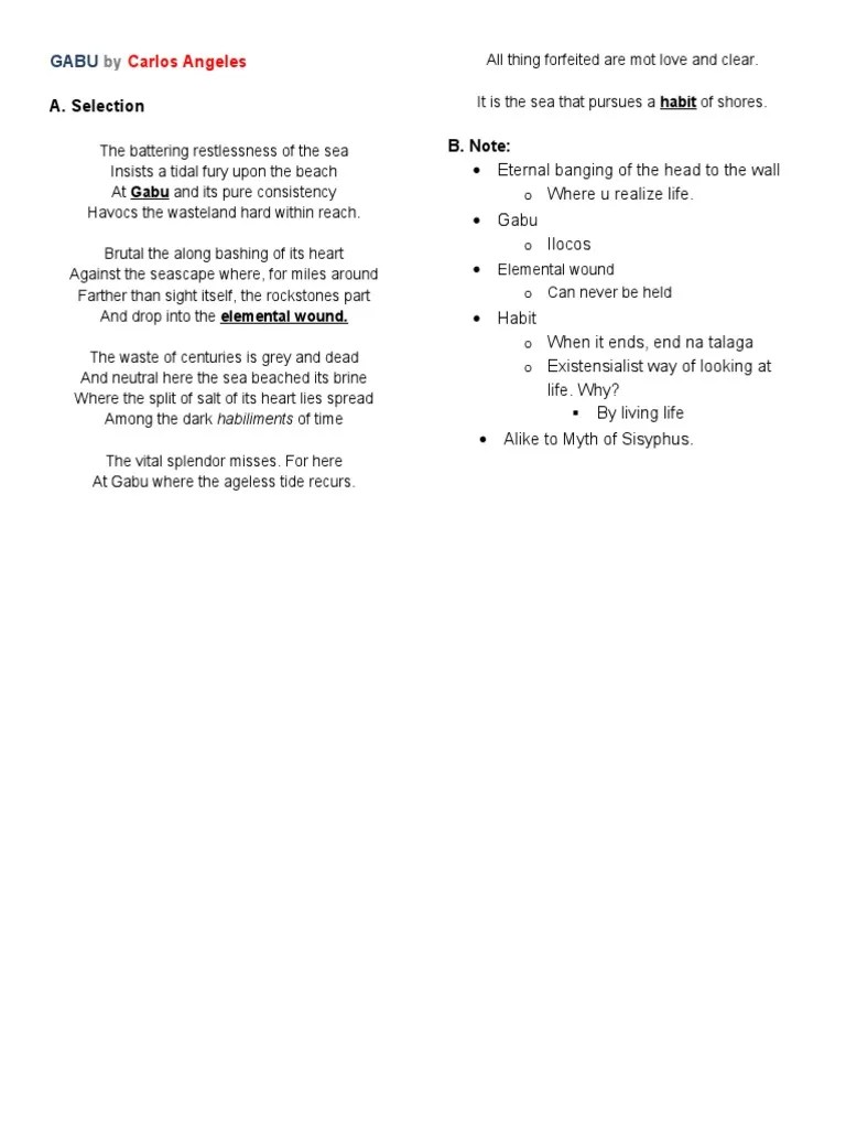 Sun in the knifed horizon bleeds the sky spilling a peacock stain upon the sands, across some murdered rocks refused to die. Often, when typhoon occurs, large tidal waves go rampant, even affecting pagudpod itself. Field concerned in/with the computer to present the use of text, graphics, drawings, video nd any other media where every type of information can be represented, stored, transmitted, or processed digitally. If it is the difficult diction ( language ) in the poem gabu then all i can advise, is use the dictionary on every word you have trouble with. Gabu by carlos angeles from reader012.dokumen.tips.